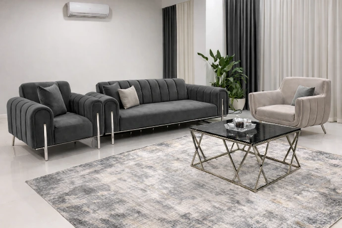 A modern three-piece living set featuring deep charcoal upholstery, sleek metal accents, and a balanced contrast armchair—designed for refined comfort and contemporary interiors.