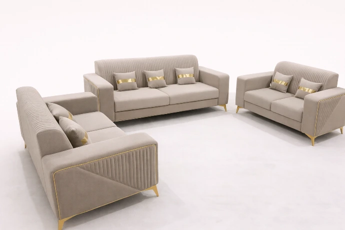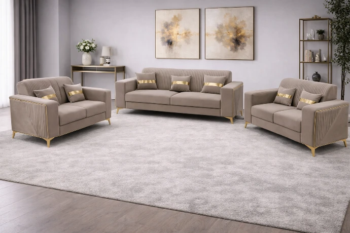 A refined three-piece sofa set in soft beige upholstery with ribbed detailing and elegant gold accents, designed for modern comfort and understated luxury.