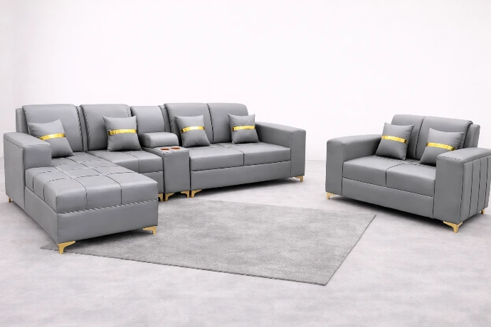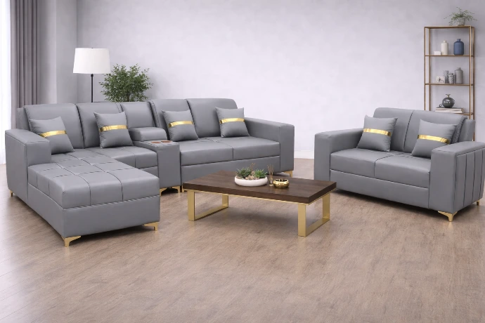 A modern three-piece L-shaped sofa set in sleek grey upholstery with gold accents, designed for refined comfort and a clean, contemporary living space.