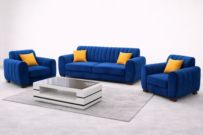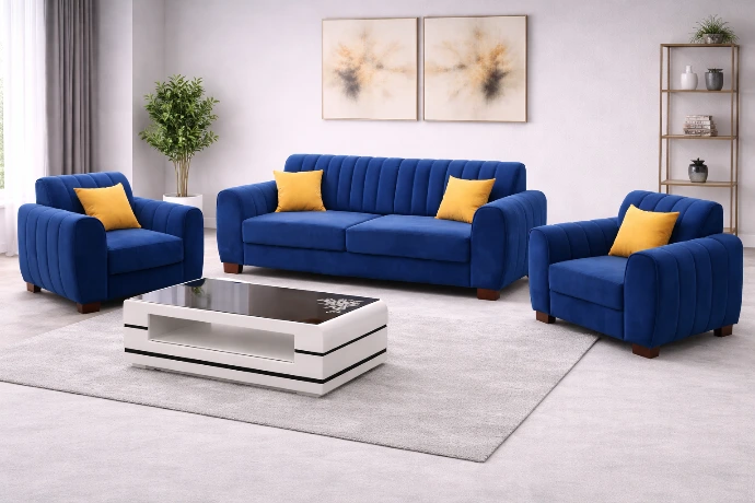 A bold three-piece sofa set in rich royal blue upholstery with vibrant accent cushions, designed to bring elegance, comfort, and a modern statement to any living space.
