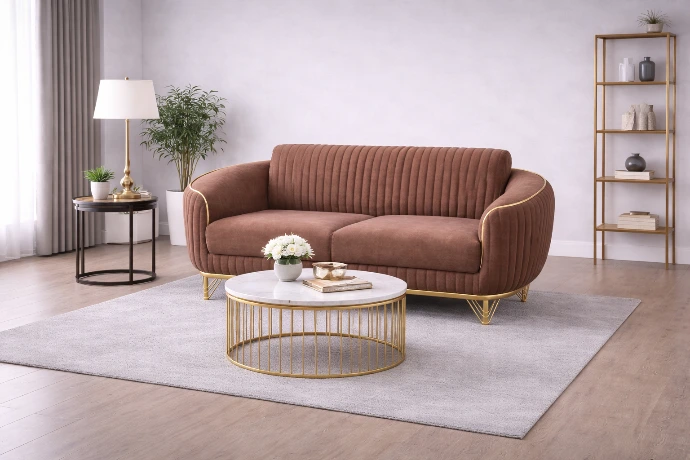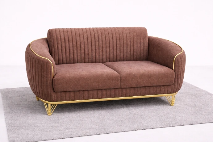 A stylish two-seater sofa upholstered in soft textured fabric with vertical rib detailing and elegant gold accents, designed to add warmth and modern luxury to any living space.