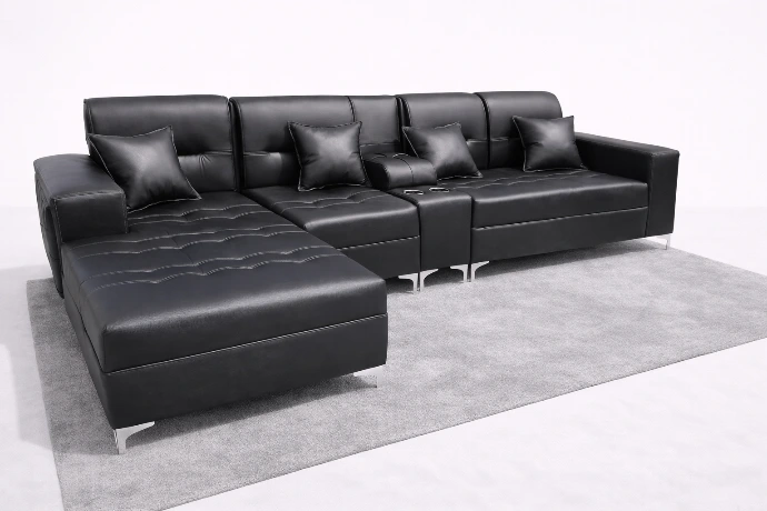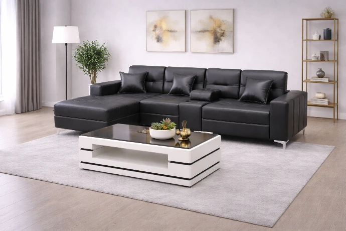 A sleek black leather L-shaped sofa with a chaise lounge, built-in cup holders, and plush cushioning—designed for modern comfort and stylish living spaces.