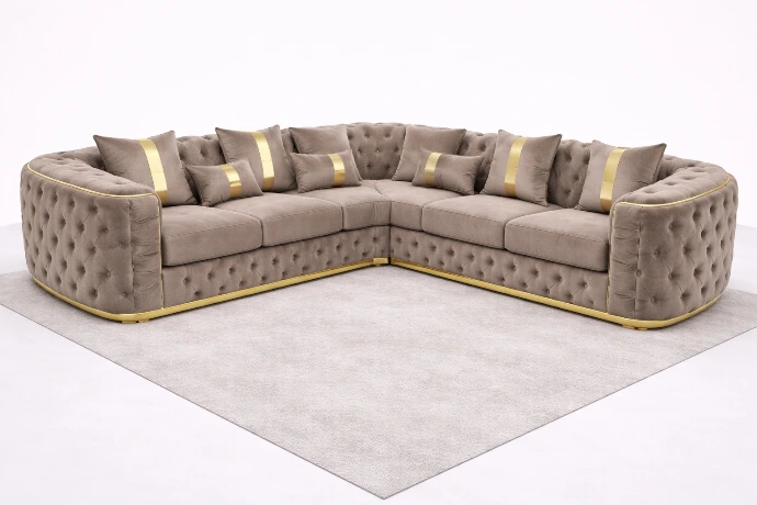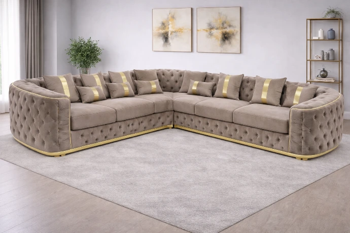 A grand U-shaped sofa upholstered in soft taupe velvet with deep button tufting and refined gold accents, designed for luxurious comfort and statement living spaces.