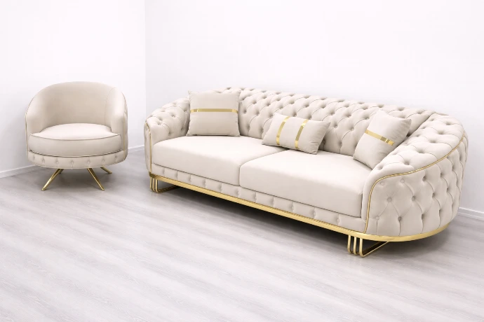 A luxurious sofa and accent chair set upholstered in soft ivory fabric with deep tufting and elegant gold accents, crafted to elevate modern and classic living spaces alike.