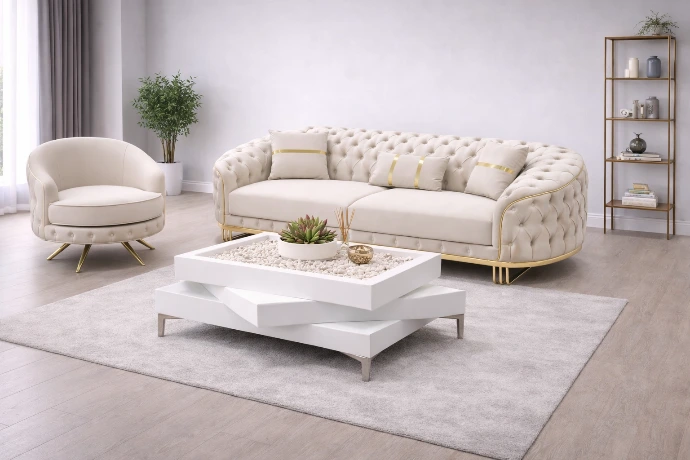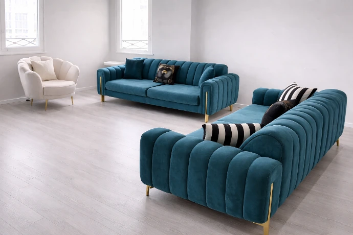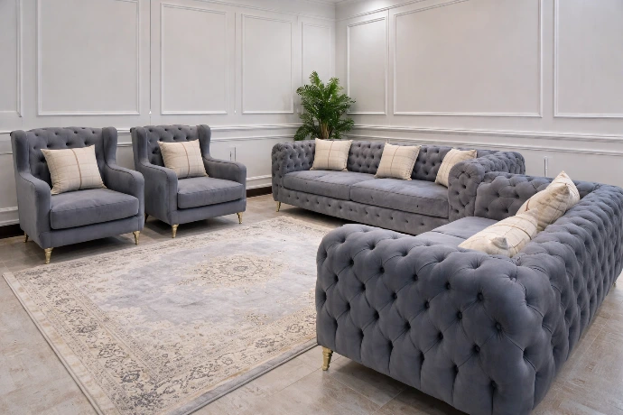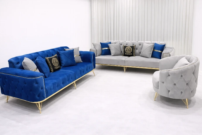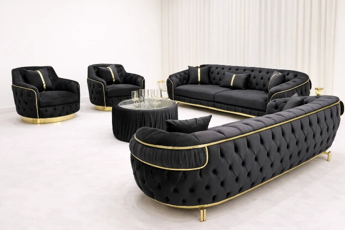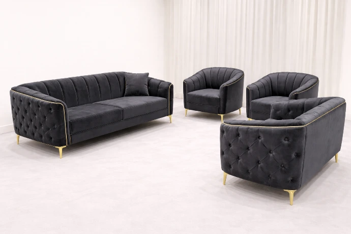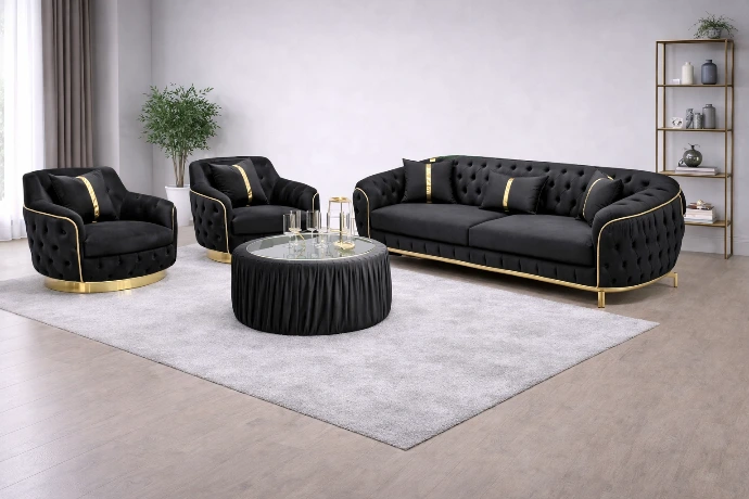 A luxurious velvet living set with deep tufted detailing and gold accents, designed to make a bold, elegant statement in premium modern interiors.
