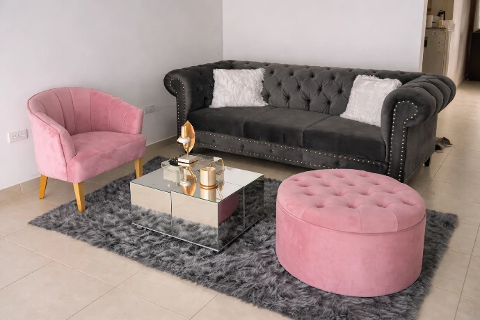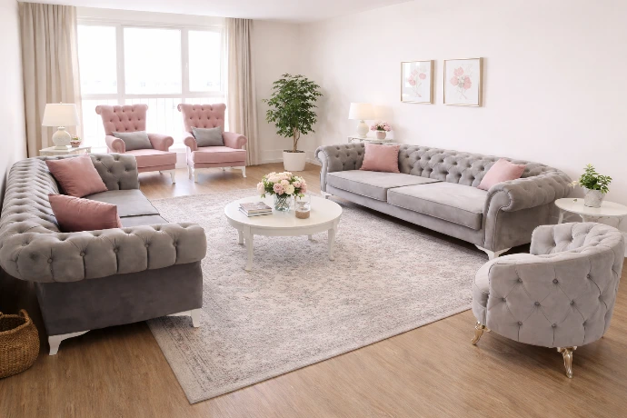 A spacious, elegant living room setup featuring tufted grey sofas and soft pink accent chairs, to create a refined, welcoming home atmosphere.