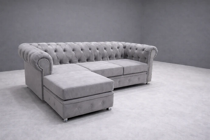 A refined light-grey Chesterfield sofa with a left-side chaise extension, featuring classic button tufting and elegant nailhead detailing for timeless comfort and style.