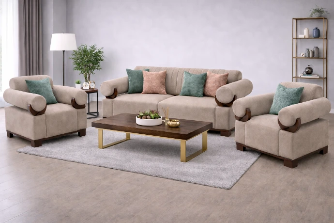 A warm, inviting three-piece sofa set with soft beige upholstery, sculpted rolled armrests, and natural wood accents—designed for relaxed comfort and timeless style.