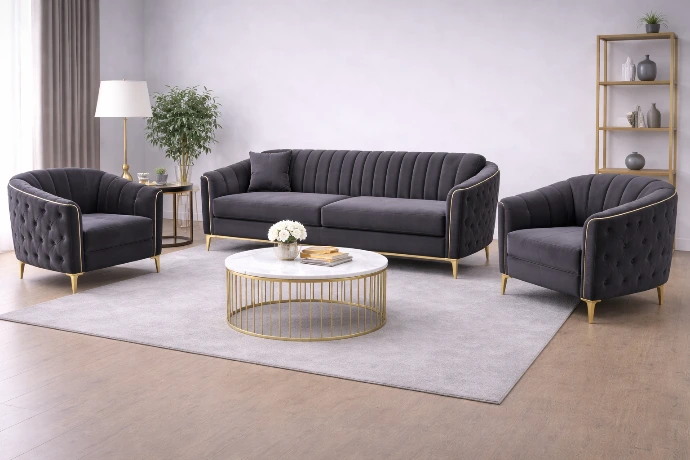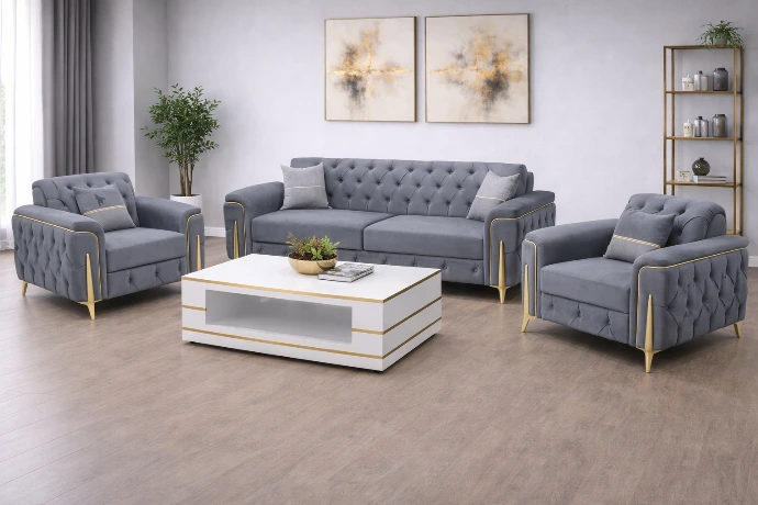 A refined three-piece seating set featuring tufted grey upholstery with gold-accent details, designed to bring modern elegance and comfort to contemporary living spaces.