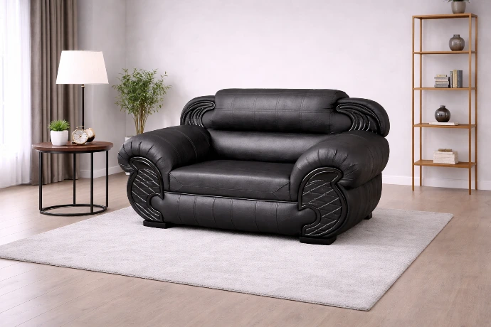 A bold black two-seater with plush cushioning and sculpted arm details, designed for classic comfort and lasting elegance.