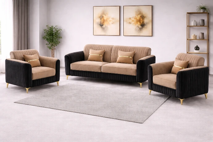 A sophisticated three-piece sofa set featuring soft beige upholstery, deep black side panels, and subtle gold accents—designed for elegant comfort in modern living spaces.