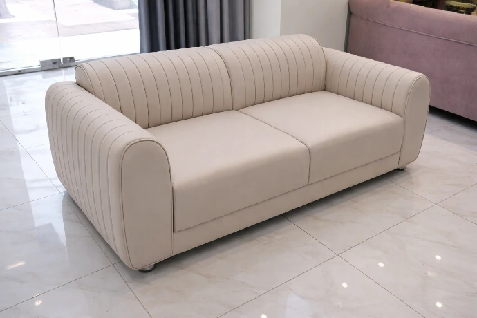 A modern two-seater with smooth curves and vertical channel detailing, designed for compact, elegant living spaces.