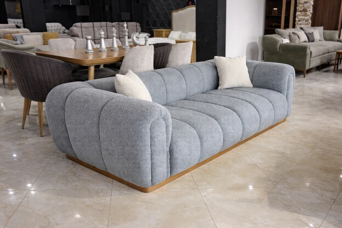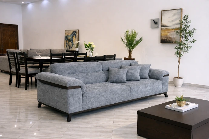 A modern grey fabric sofa with clean lines and plush cushions, designed for stylish and comfortable everyday living.