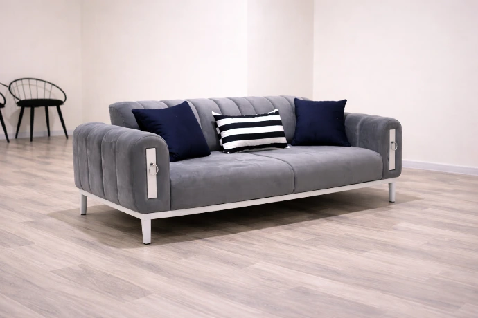 A sleek, space-efficient three-seater with soft grey upholstery and modern metal accents, designed for contemporary interiors.
