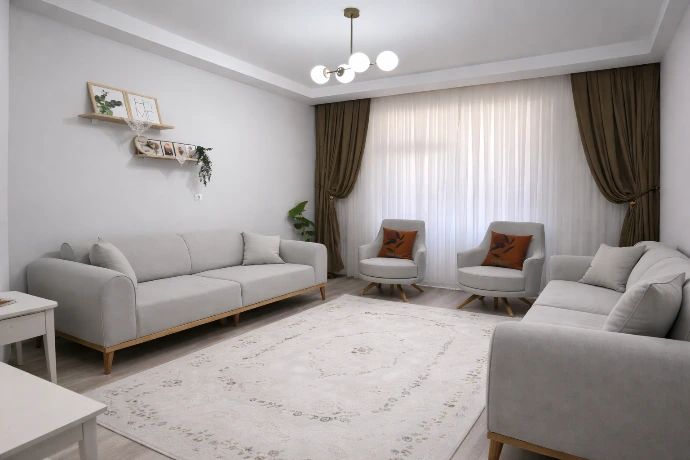 A calm, modern living room set with soft grey seating, warm accents, and a balanced, airy layout ideal for contemporary homes.