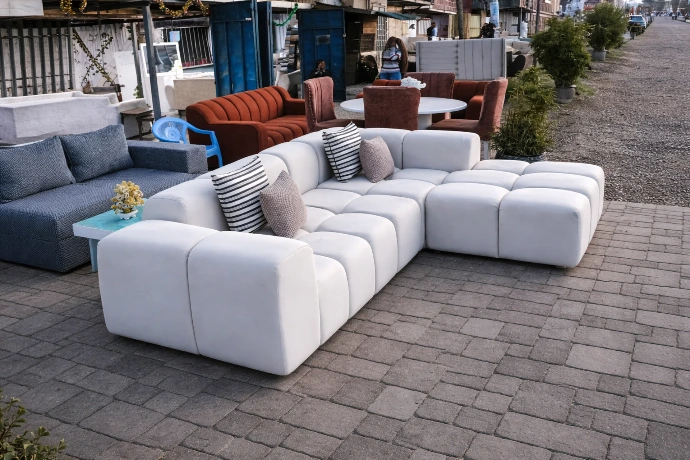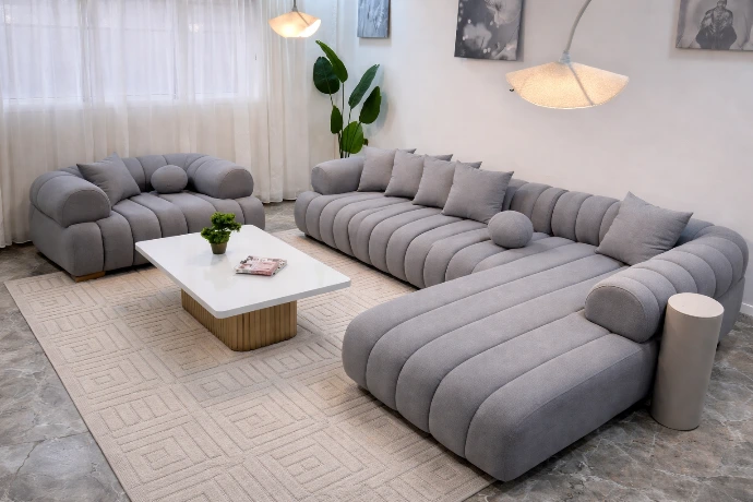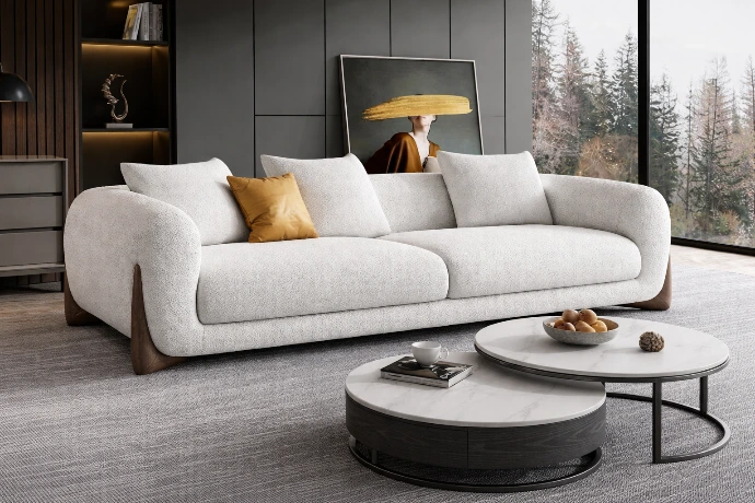 A modern curved sofa ensemble with plush cushioning, designed for relaxed luxury and elegant living spaces.