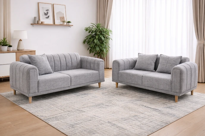 A clean, modern two-sofa set with defined seat lines, compact proportions, and soft grey upholstery—ideal for elegant, space-efficient living rooms.