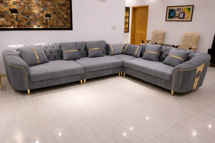 A refined grey velvet L-shaped sofa with gold accents, offering elegant comfort for modern living spaces.