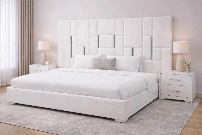 A modern white upholstered headboard featuring layered geometric panels for a clean, elegant, and hotel-inspired bedroom look.