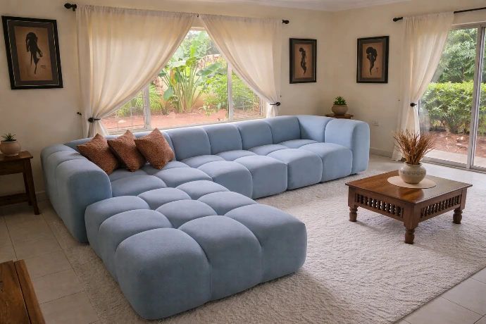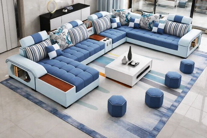 A spacious U-shaped modular lounge in layered blue tones, featuring plush tufted seating, integrated side tables, and a contemporary design that blends comfort, functionality, and modern elegance for stylish living spaces.