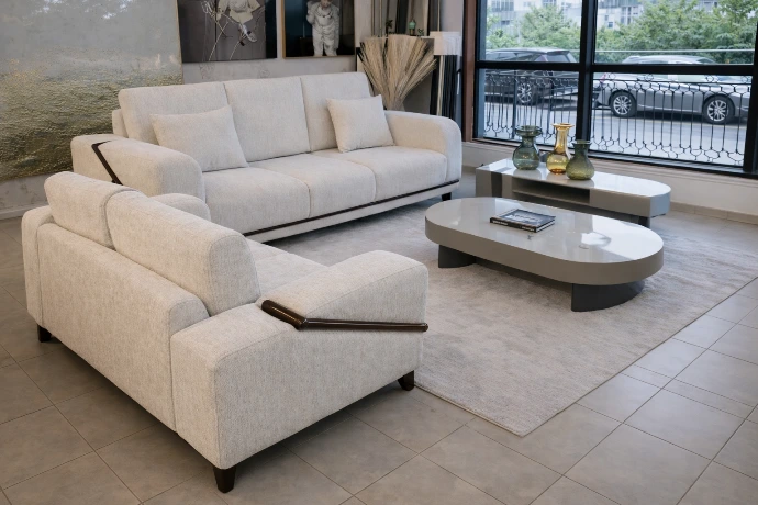 A sleek off-white fabric living room set with compact seating, smooth contours, and refined wooden accents, designed for modern homes seeking comfort without occupying excess space.