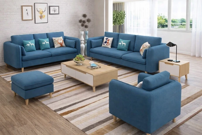 A modern blue fabric living room set featuring plush sofas, an armchair, and an ottoman, designed for comfort, elegance, and stylish contemporary homes.