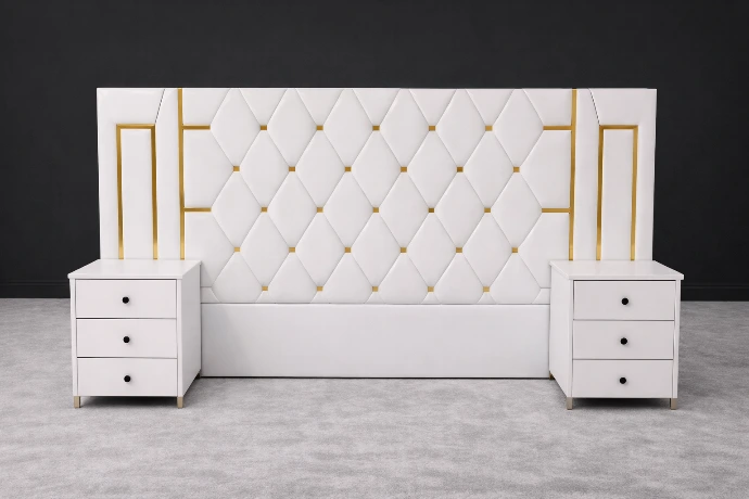 A luxurious white upholstered headboard featuring elegant diamond tufting and refined gold accent lines, designed to add a touch of sophistication and modern glamour to any bedroom setting.