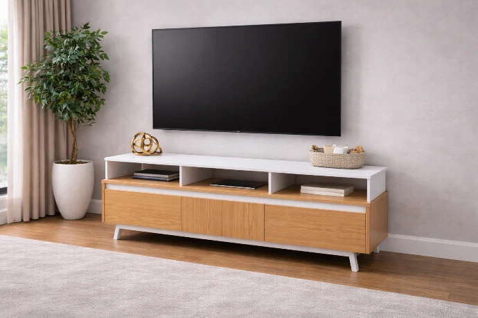 A sleek modern TV display featuring a white display top and warm oak-finish storage cabinets, designed to offer functional media organization while adding a calm, Scandinavian-inspired touch to contemporary living rooms.