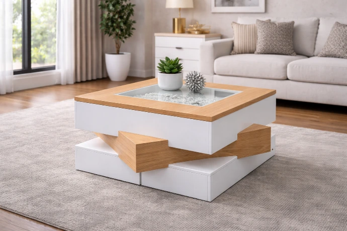 A contemporary coffee table featuring a striking geometric base, smooth white finish, and an inset glass top filled with decorative stones, designed to add modern character and visual balance to stylish living rooms.