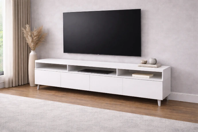 A modern low-profile TV display unit featuring a clean white finish, extended top panel, and open central shelving, designed for minimalist interiors that value simplicity, balance, and practical media storage.