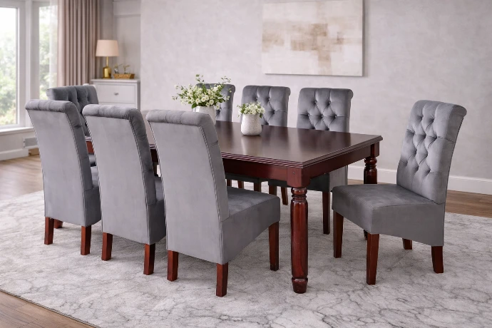 A classic wooden dining set featuring a rich polished table paired with high-back, tufted upholstered chairs, designed to combine timeless craftsmanship, comfort, and elegance for family dining spaces.