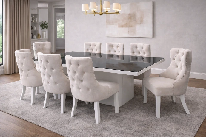 A sophisticated dining set featuring a sleek black glass tabletop paired with plush cream tufted chairs, designed to deliver modern elegance, comfort, and a striking statement for contemporary home dining spaces.