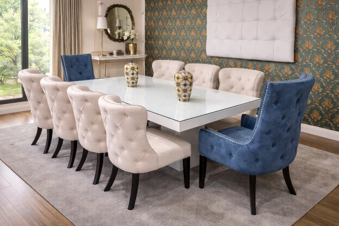 A luxurious dining set featuring a sleek white glass table paired with plush tufted velvet chairs in cream and royal blue, designed to bring refined elegance, comfort, and a statement look to modern dining spaces.